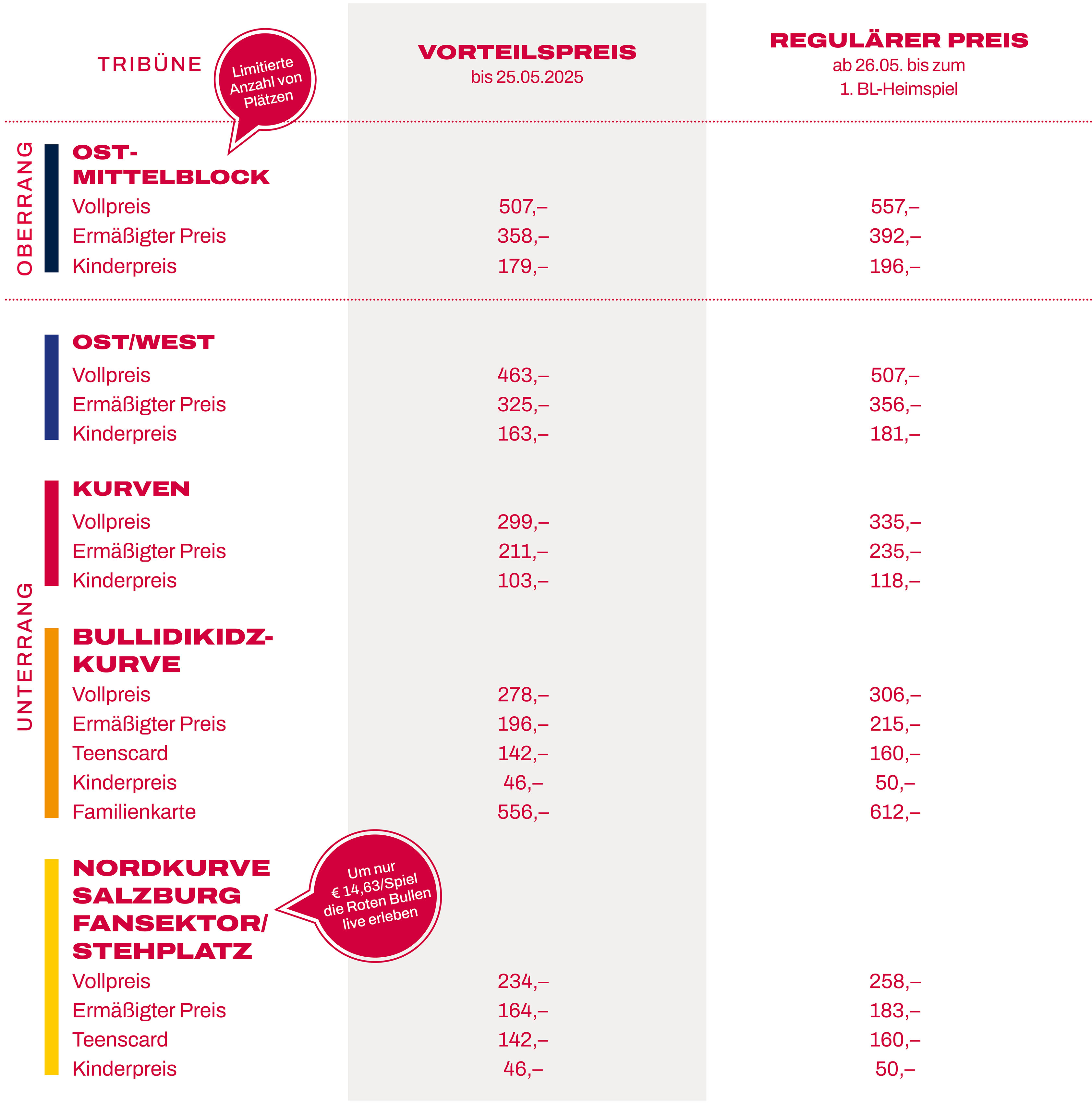 ERMÄSSIGTER PREIS: Gültig für Schüler, Lehrlinge, Studenten, Pensionisten, Zivil- und Präsenzdiener, Jugendliche (Geburtsjahrgänge 2008 bis 2011) und für Menschen mit Beeinträchtigung (Details unter www.redbullsalzburg.at)